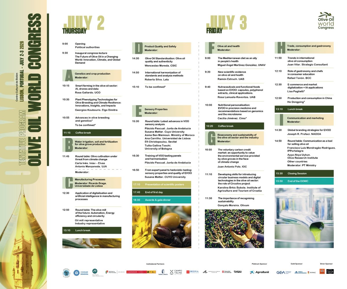 Con este programa preliminar, el Olive Oil World Congress 2026 consolida su posición como uno de los principales foros científicos internacionales dedicados al aceite de oliva. Durante dos días, Lisboa será el epicentro del debate académico, tecnológico y estratégico de un sector clave para el mercado global.